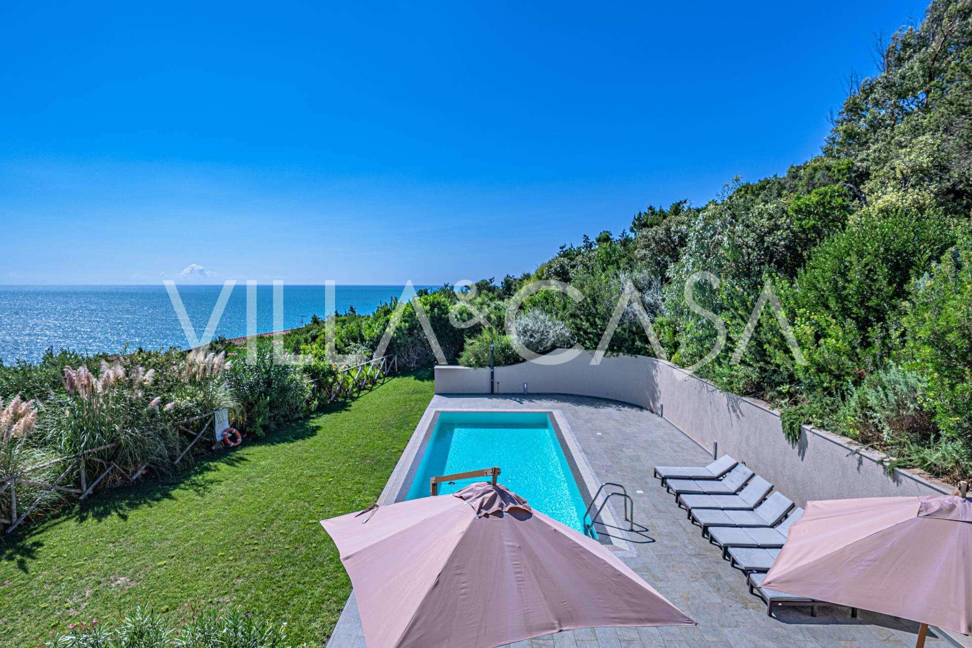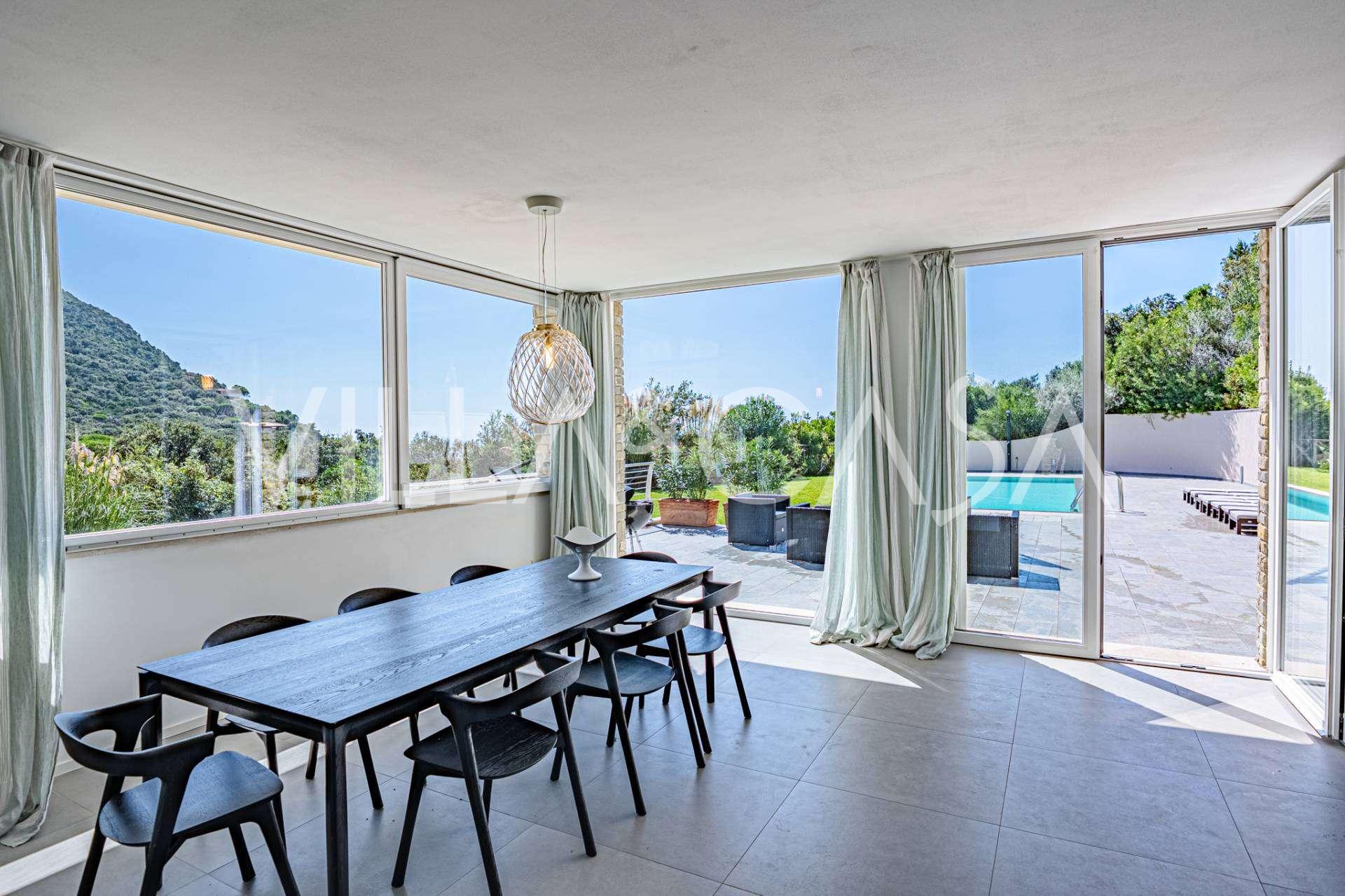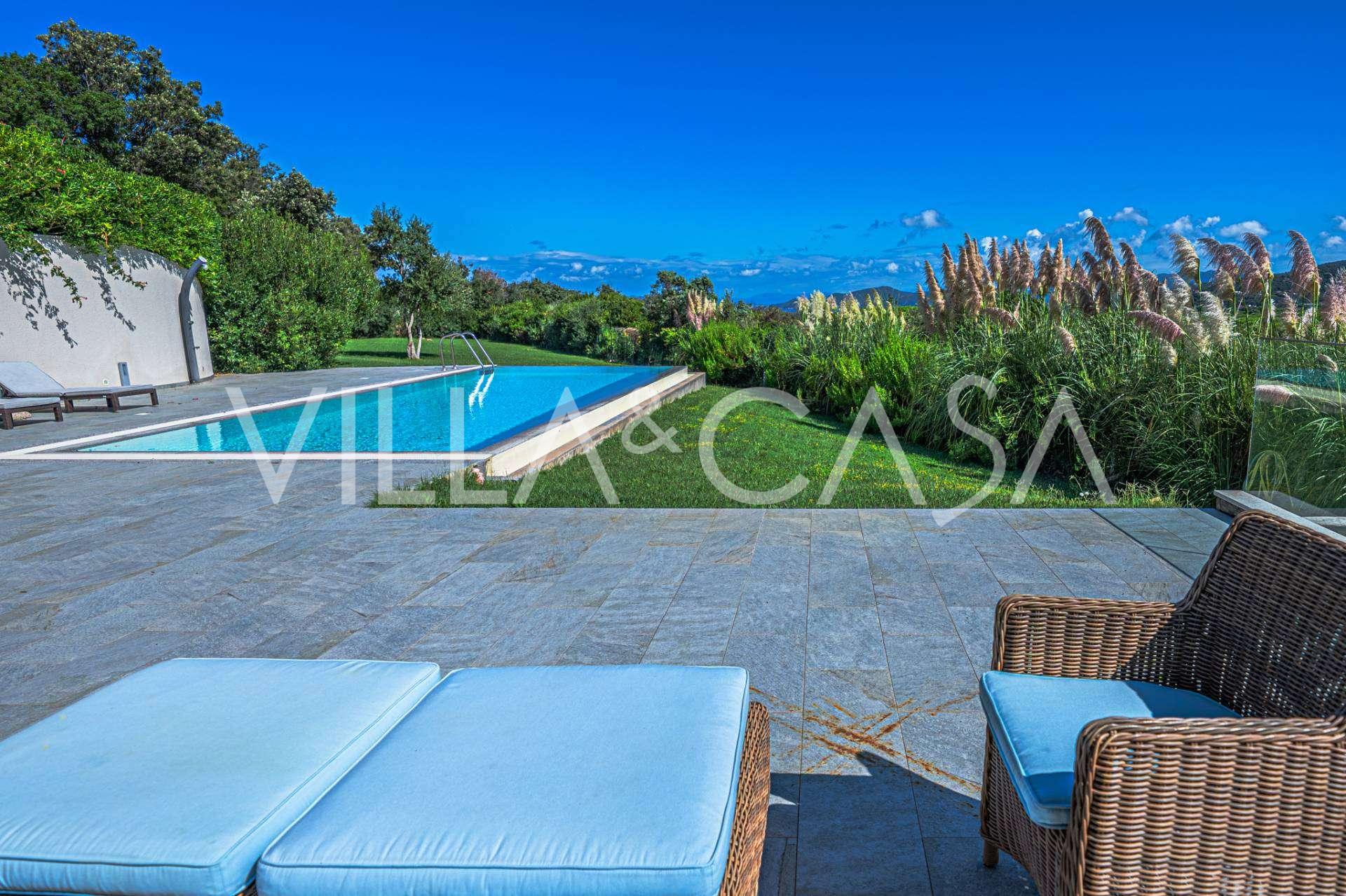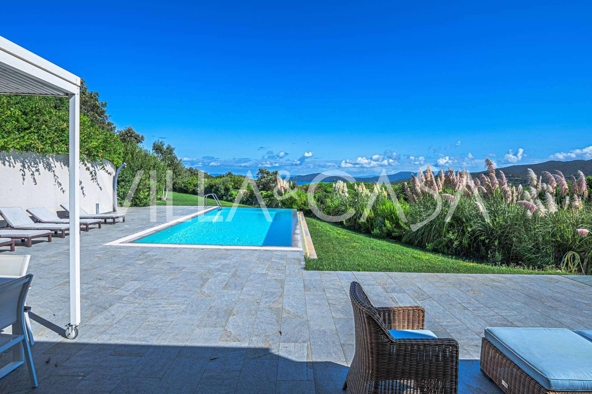 Bazén, obklopený zónou pro opalování s lehátky a designovým nábytkem, je centrem otevřených prostor: ideální místo pro odpočinek s úchvatným výhledem na záliv.