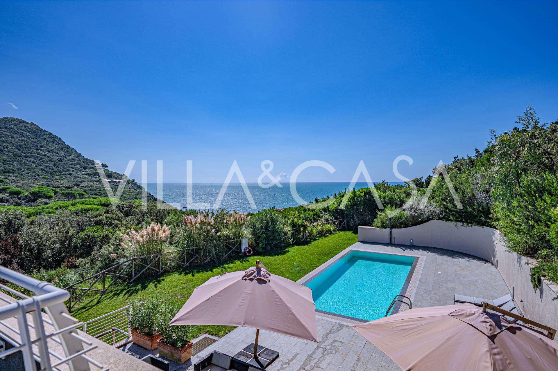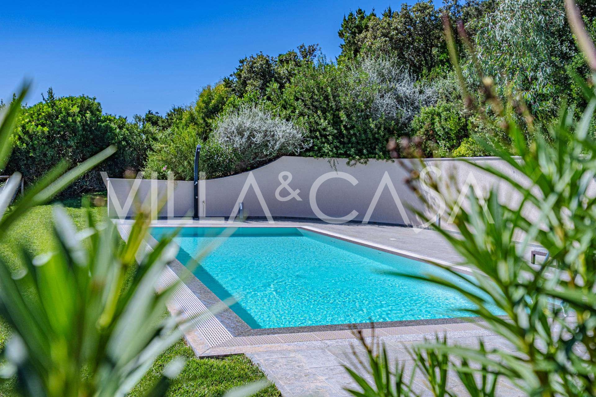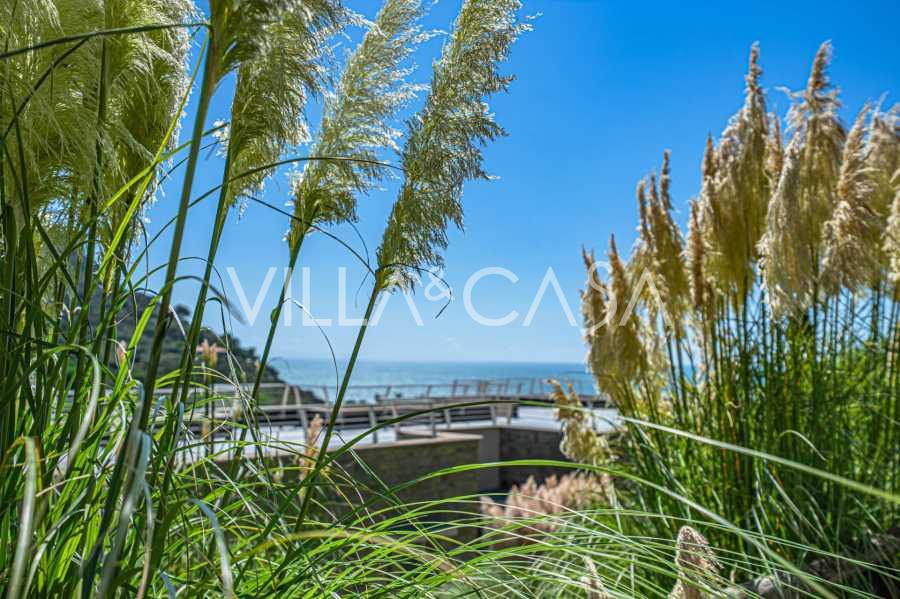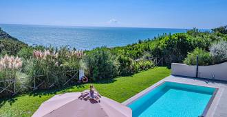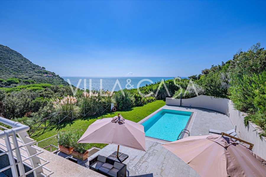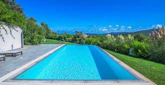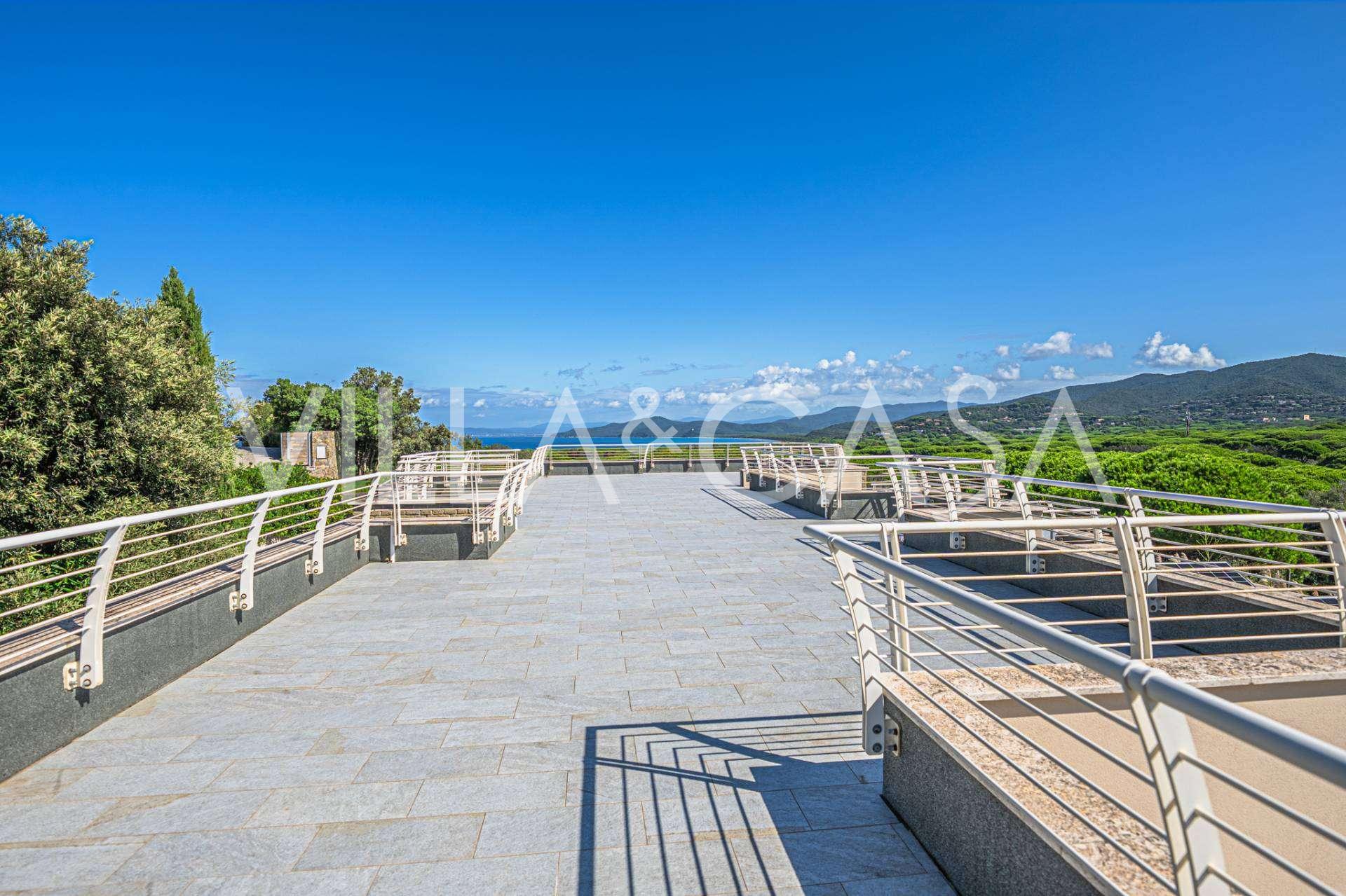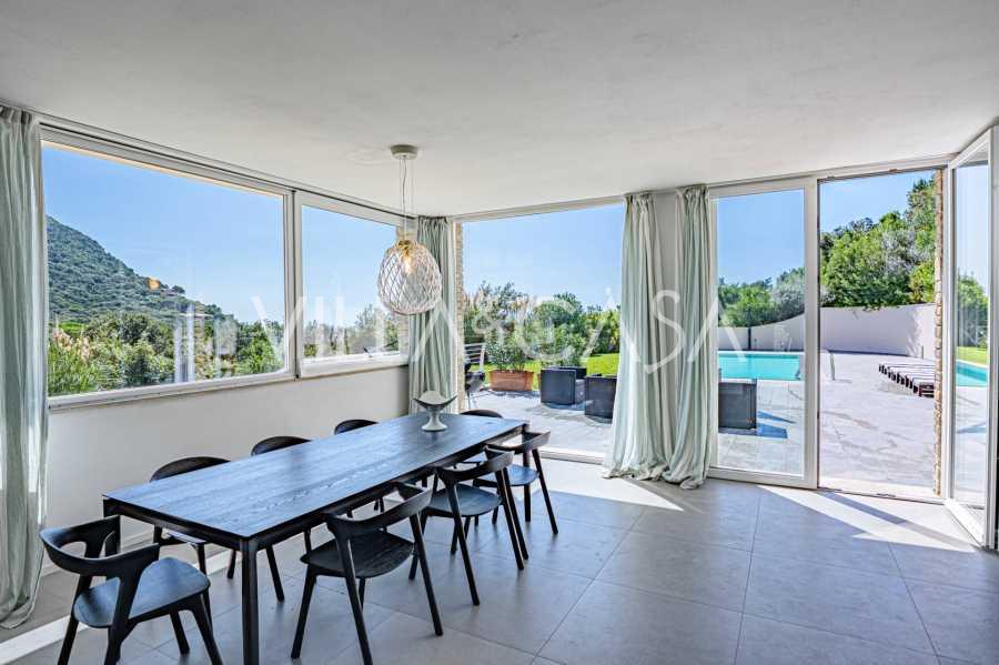 Bazén, obklopený zónou pro opalování s lehátky a designovým nábytkem, je centrem otevřených prostor: ideální místo pro odpočinek s úchvatným výhledem na záliv.
