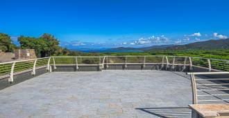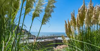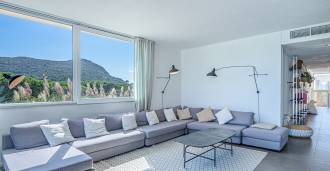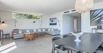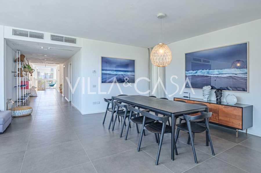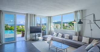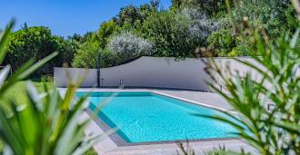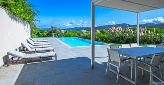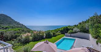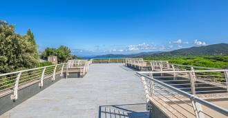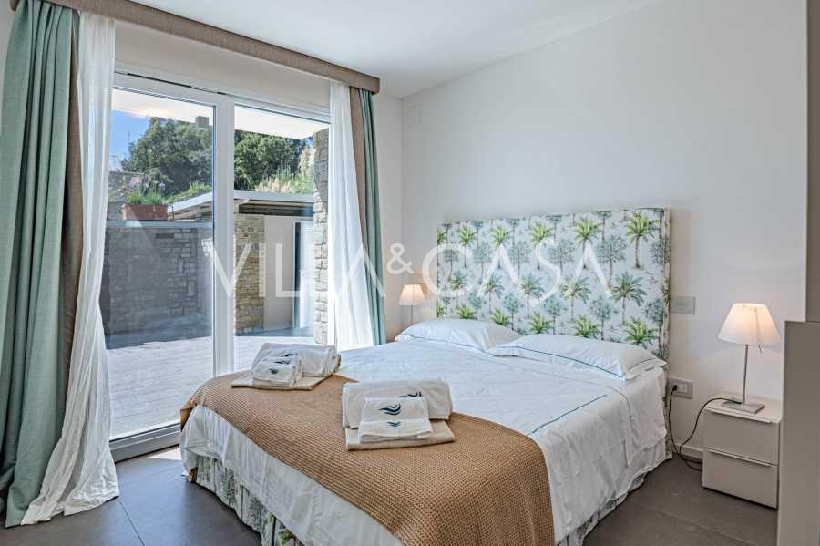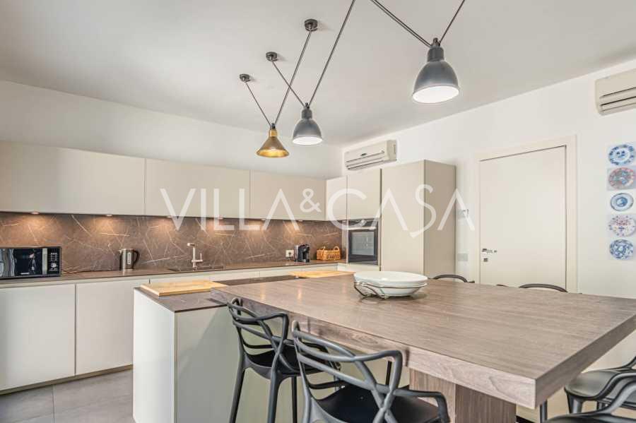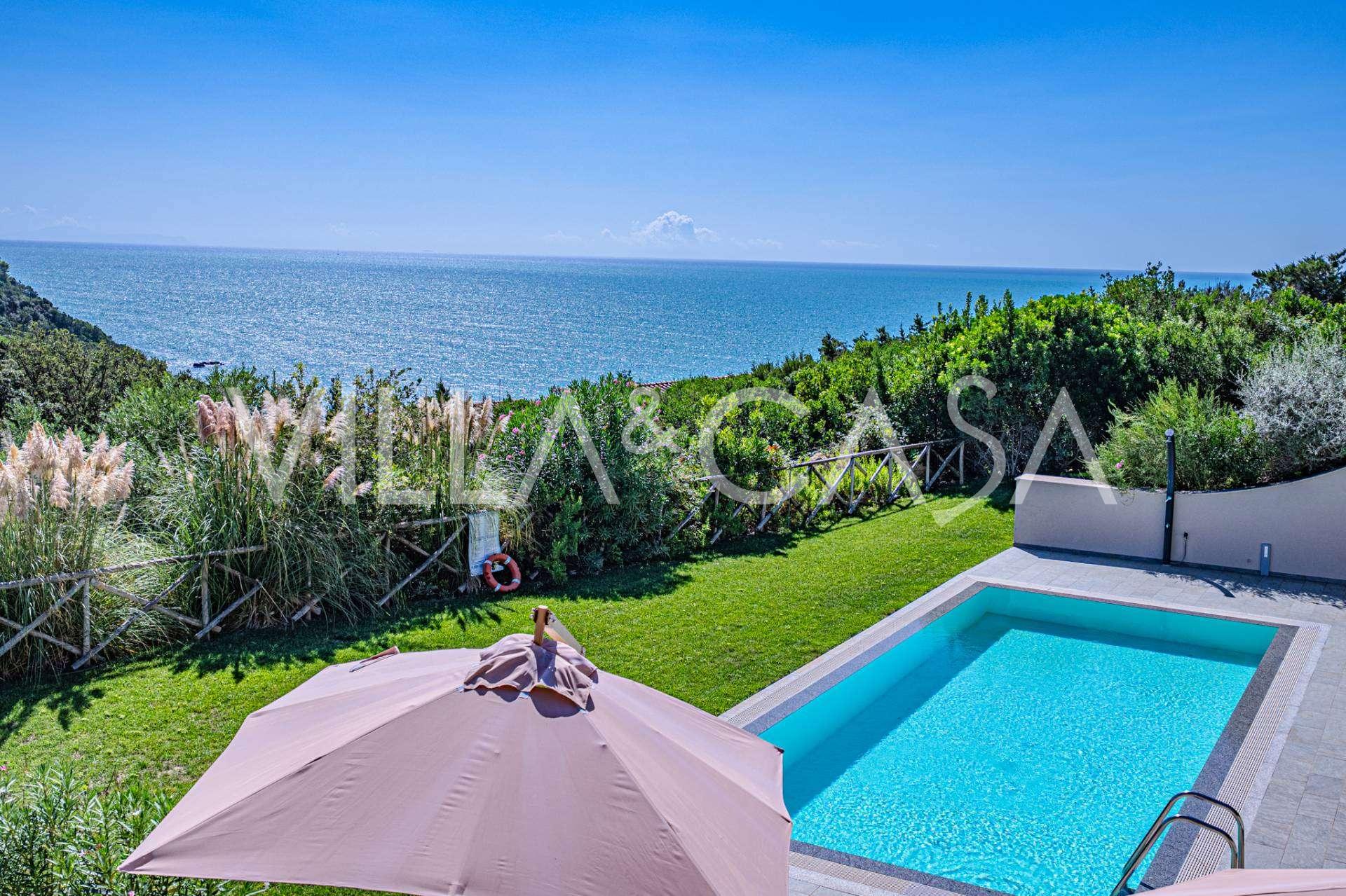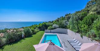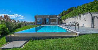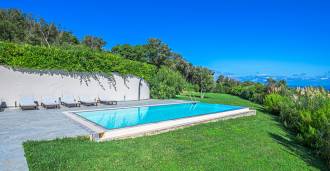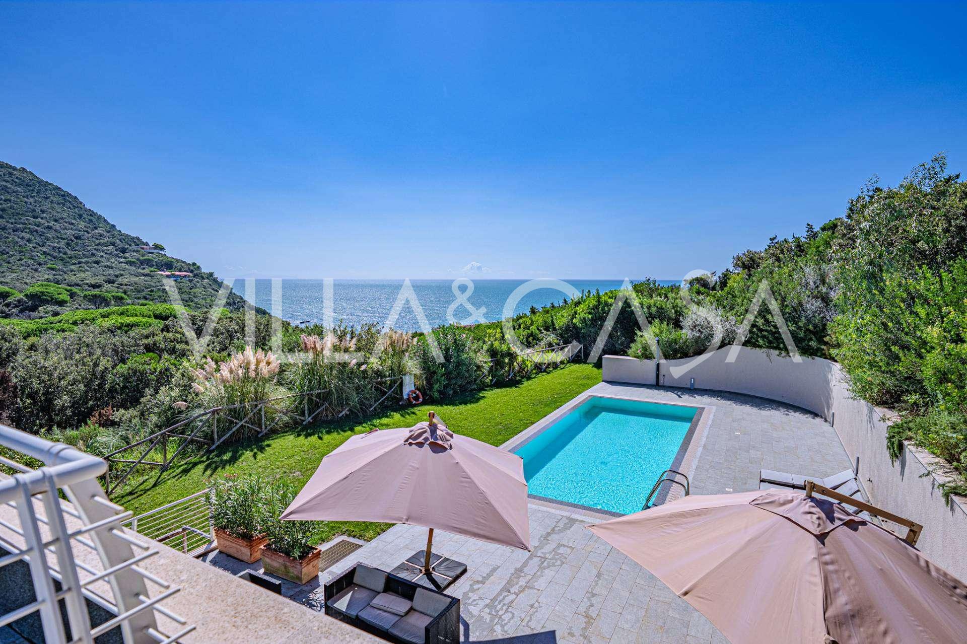 Bazén, obklopený zónou pro opalování s lehátky a designovým nábytkem, je centrem otevřených prostor: ideální místo pro odpočinek s úchvatným výhledem na záliv.