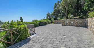 Vstup na pozemek je přes elegantní soukromou bránu, která vede k pohodlnému a skrytému parkovišti. Cesta obklopená zelení vede k bezpečnému vstupu do vily, která je umístěna na jedné úrovni, což zajišťuje funkčnost a celistvost prostoru.