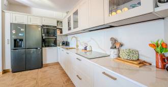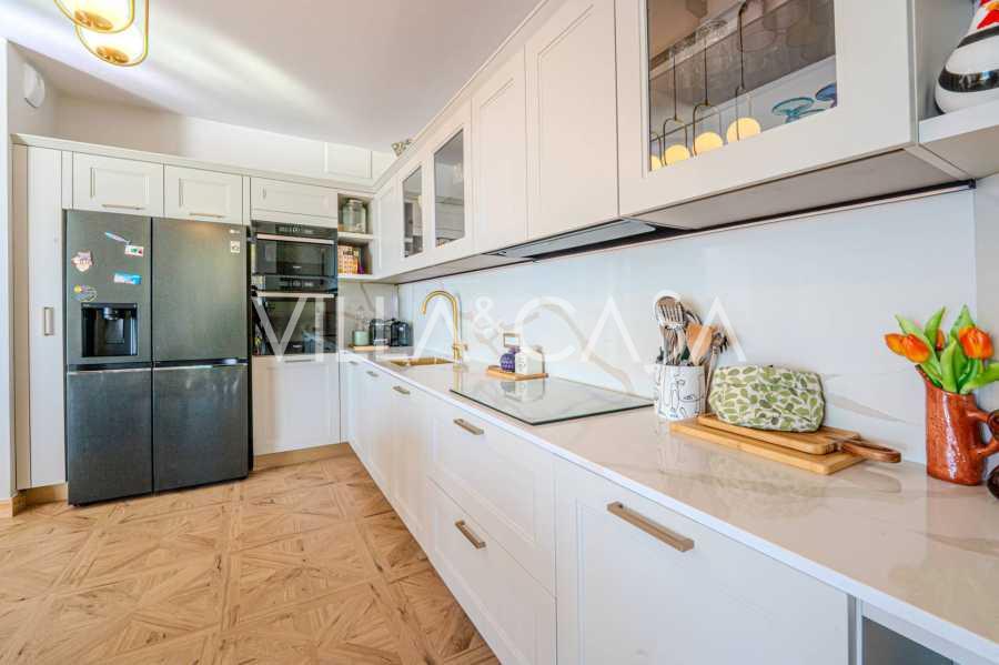 Dispozice zahrnuje tři ložnice, z nichž dvě mají přímý vstup na balkon s výhledem na moře, a tři koupelny, které jsou vybaveny vysoce kvalitními materiály.