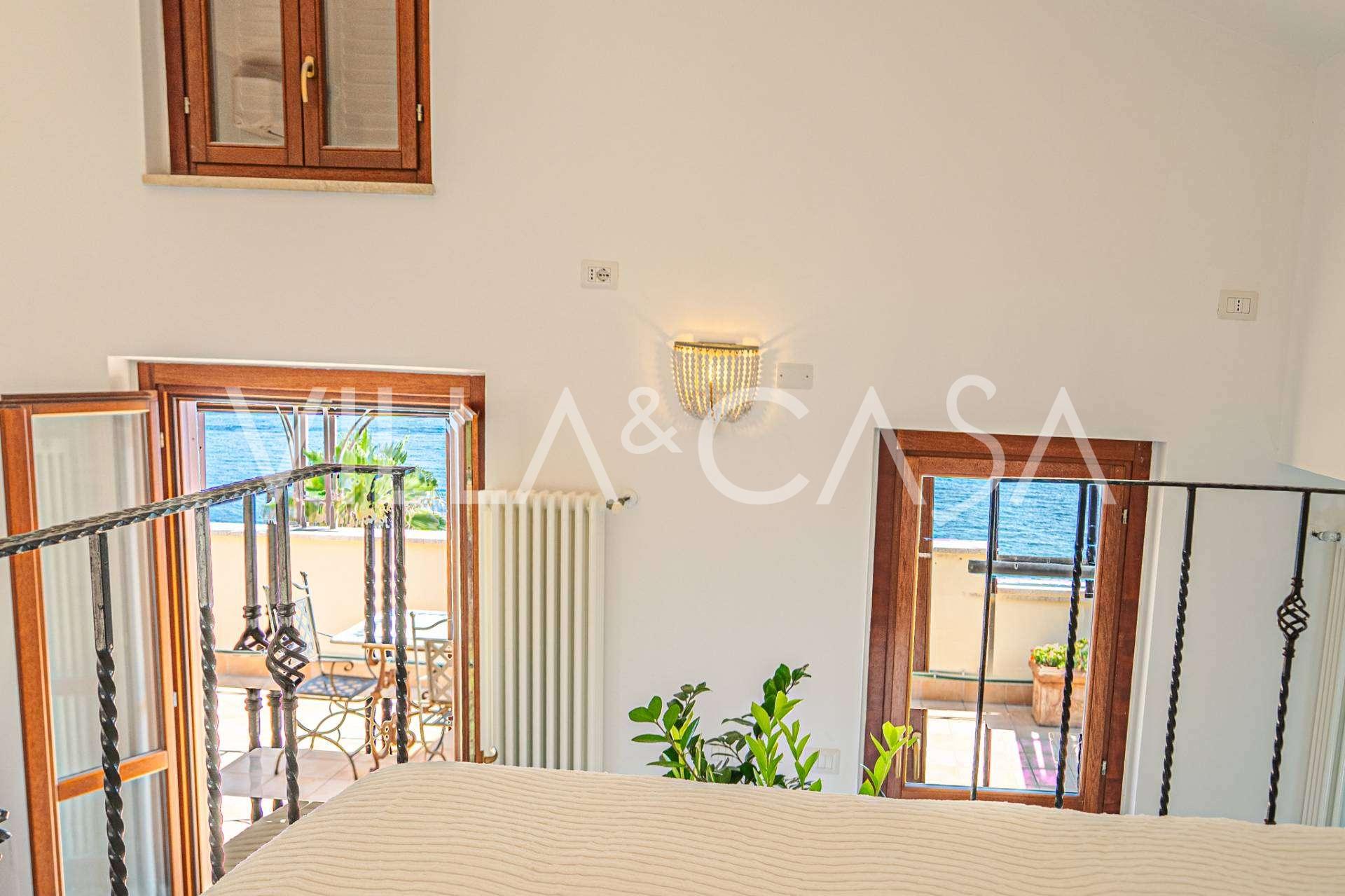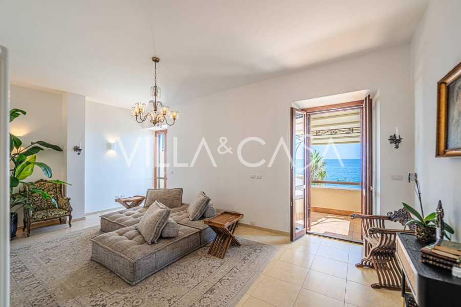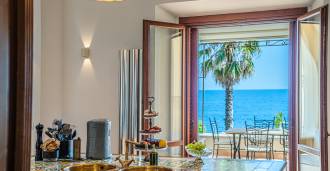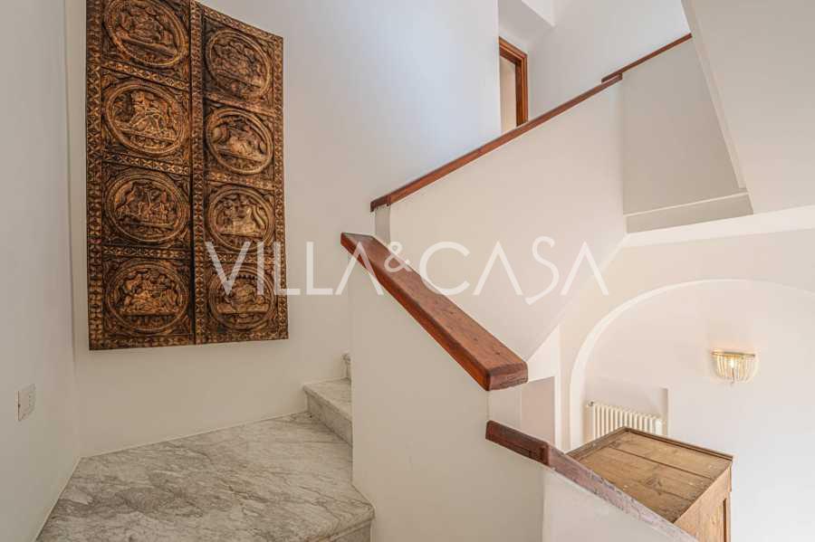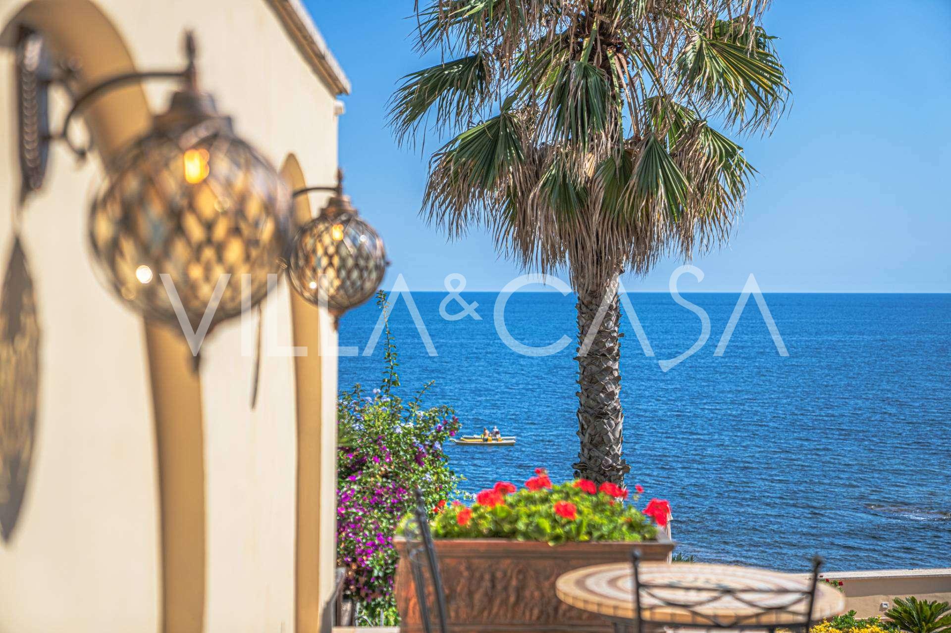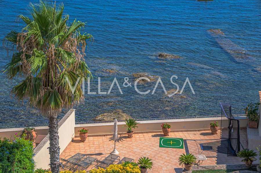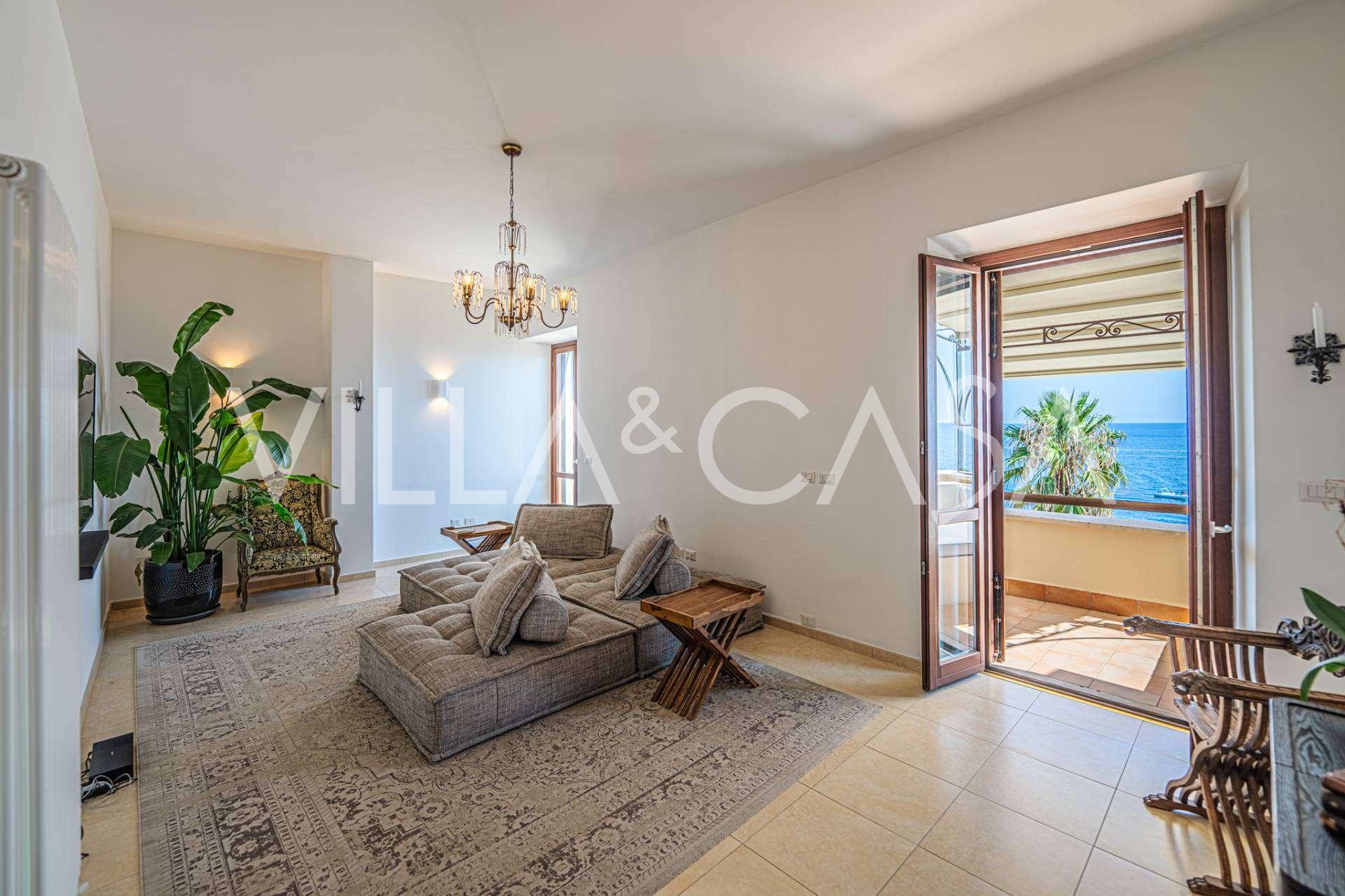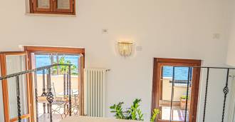 Okna nabízejí panoramatický 180stupňový výhled na moře, modrý horizont zaplňuje každý vnitřní prostor a rozprostírá se až na široké panoramatické terasy. Vnitřní prostory s vysokými stropy přes tři metry, terakotovými podlahami z té doby, mramorovým schodištěm a krbem vytvářejí atmosféru vytříbené, nadčasové elegance.
