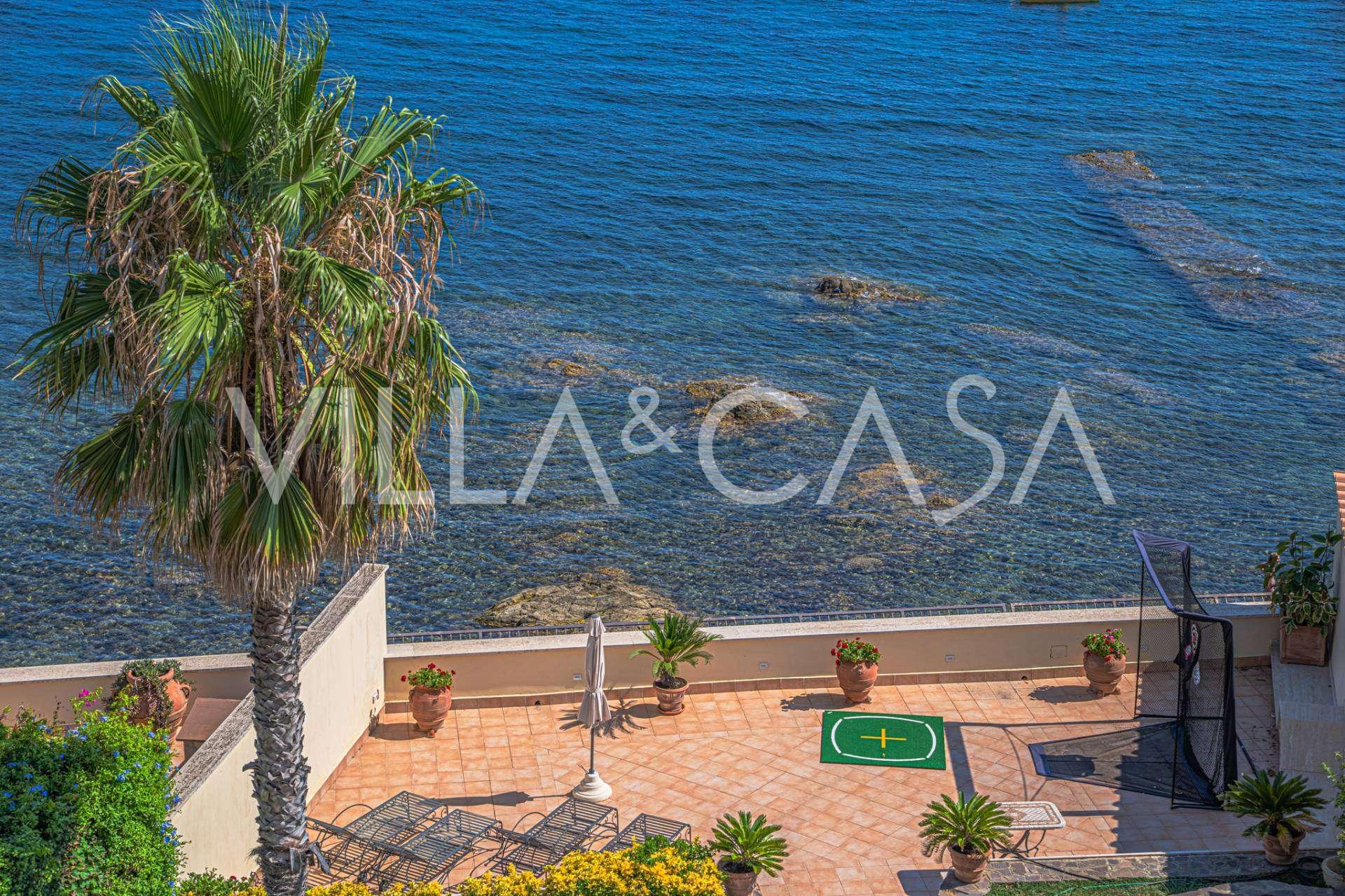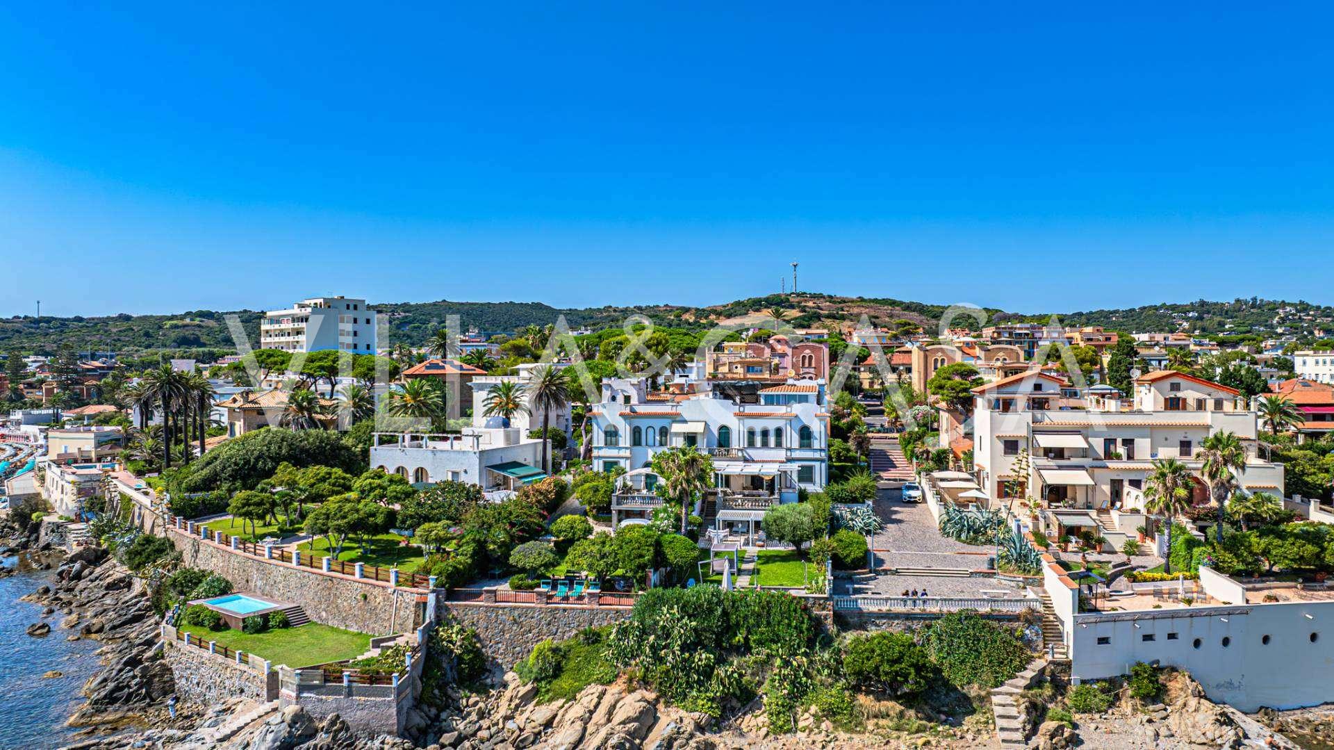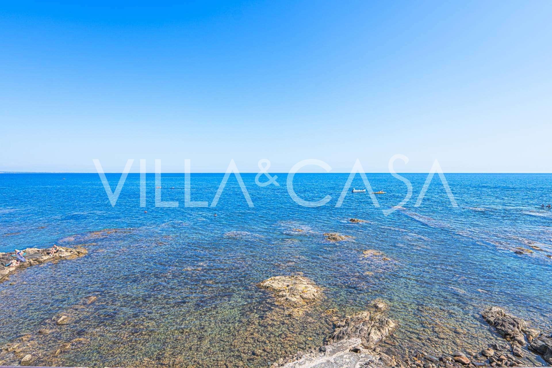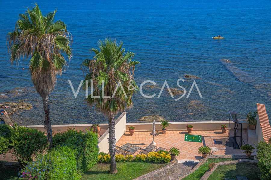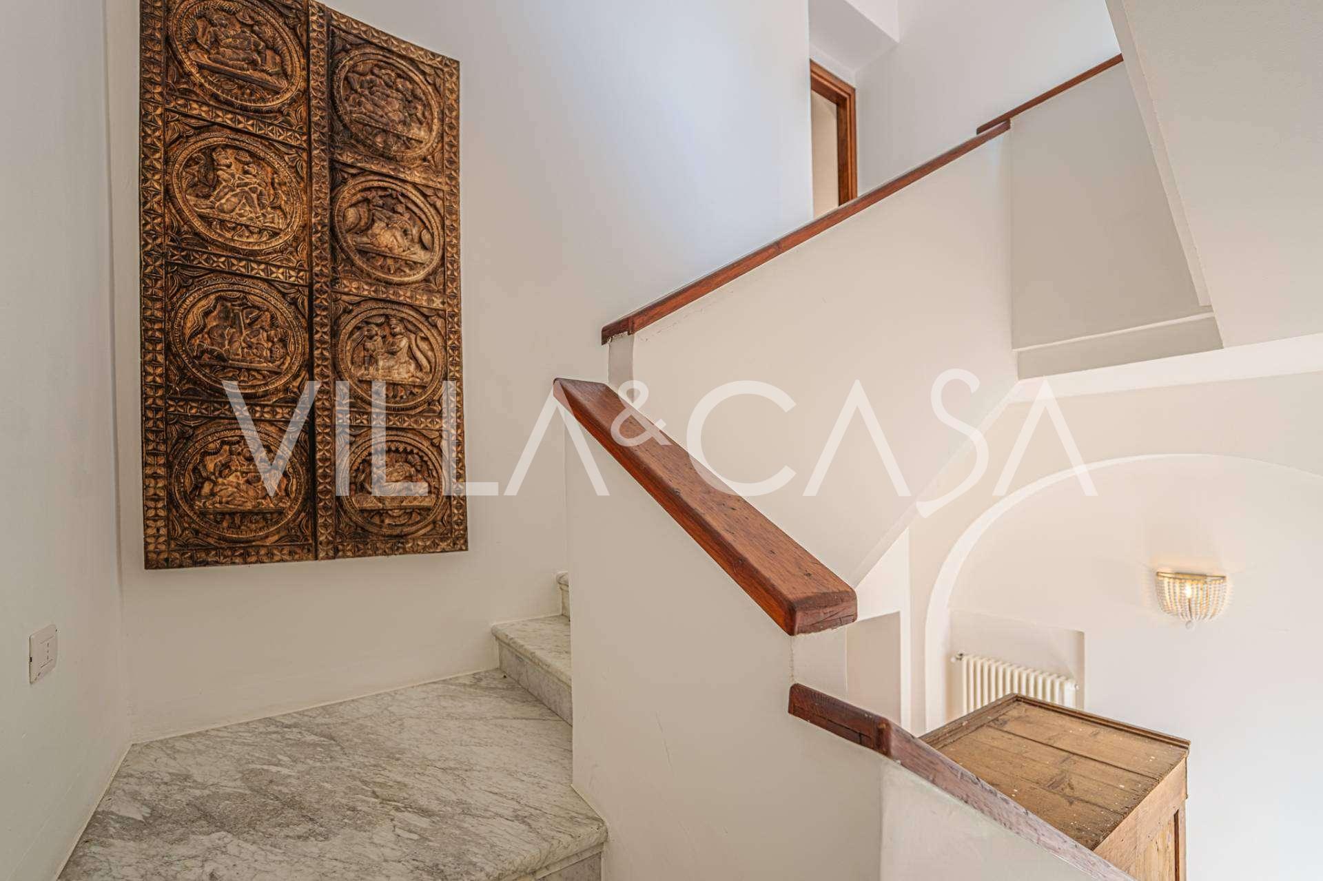Okna nabízejí panoramatický 180stupňový výhled na moře, modrý horizont zaplňuje každý vnitřní prostor a rozprostírá se až na široké panoramatické terasy. Vnitřní prostory s vysokými stropy přes tři metry, terakotovými podlahami z té doby, mramorovým schodištěm a krbem vytvářejí atmosféru vytříbené, nadčasové elegance.