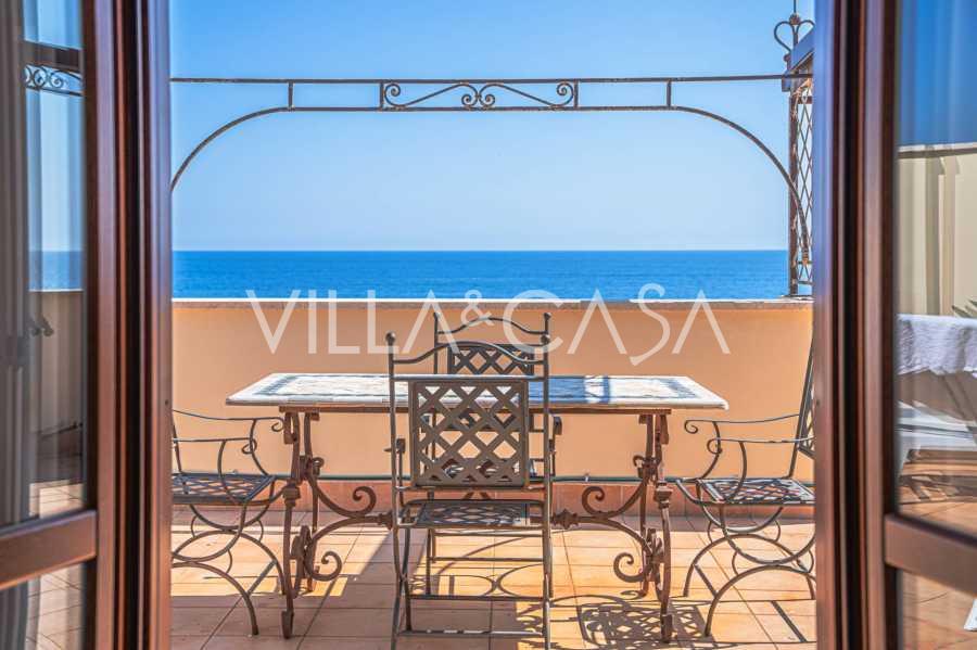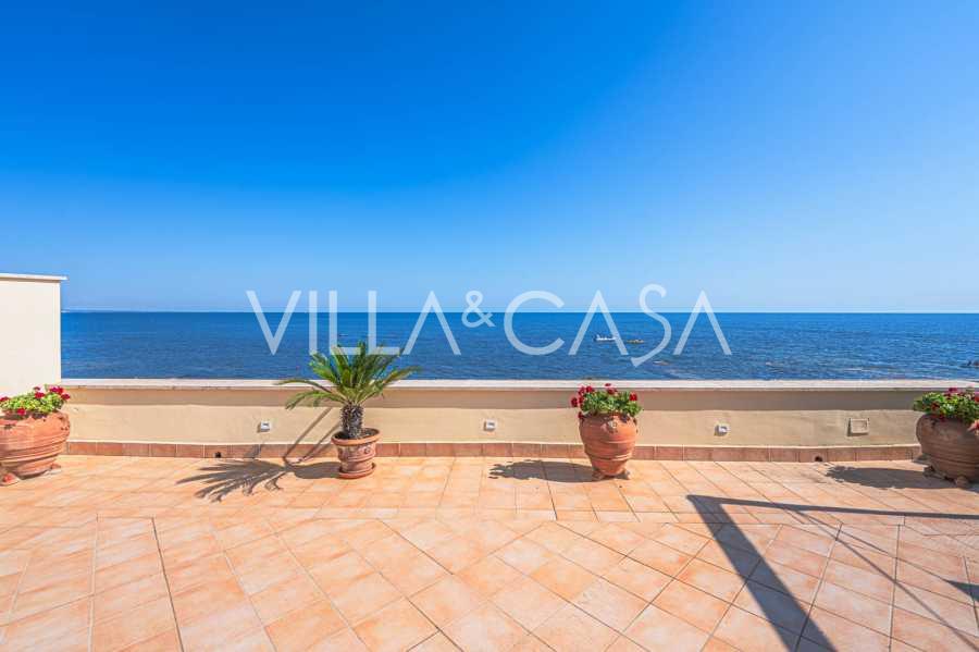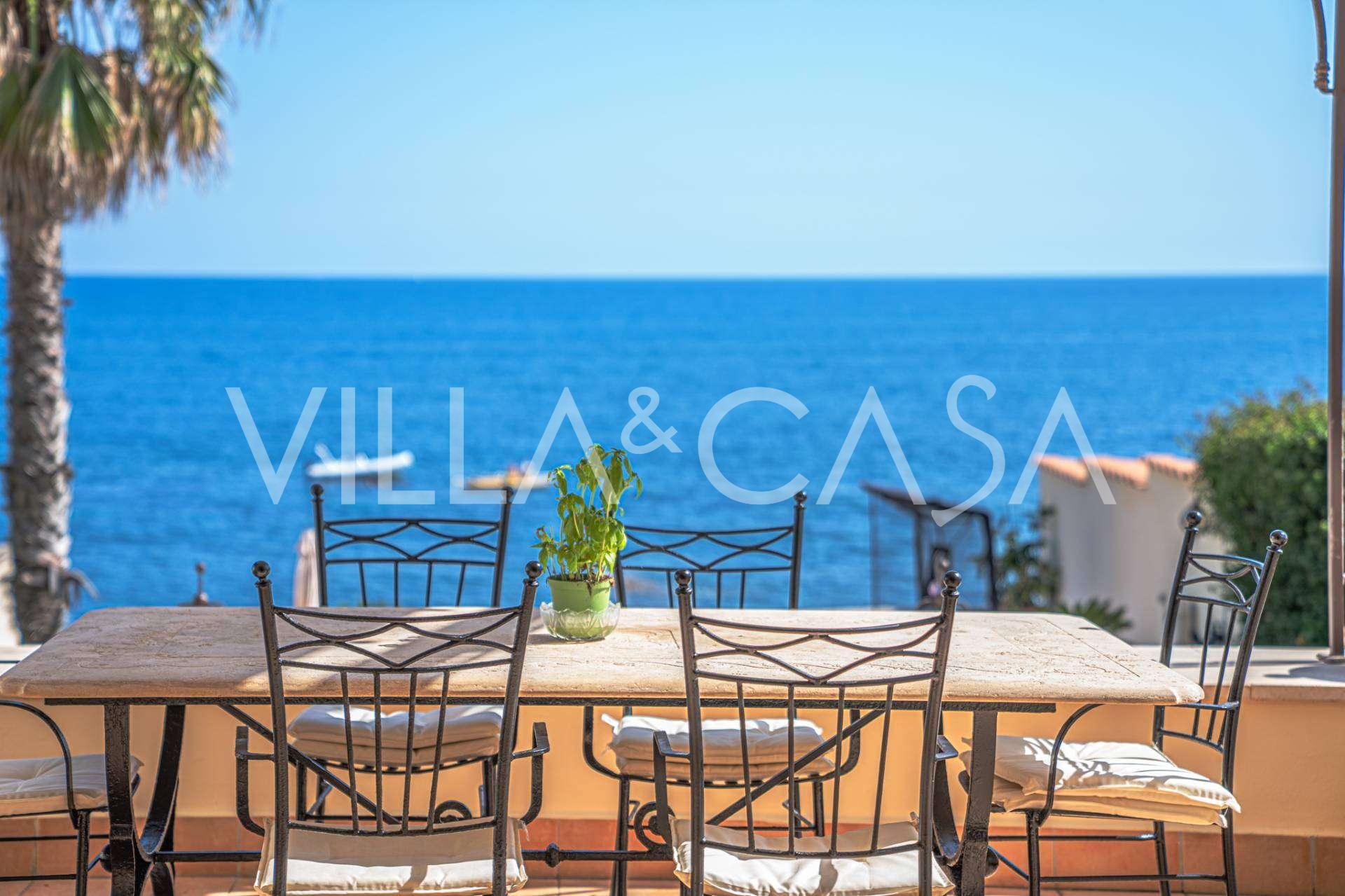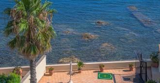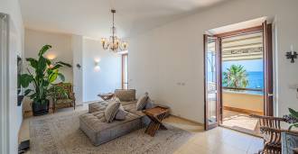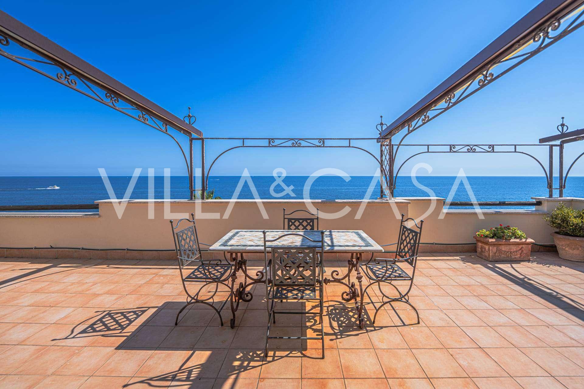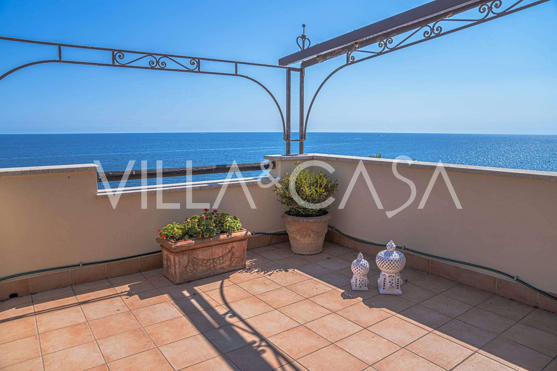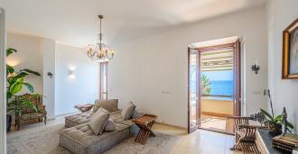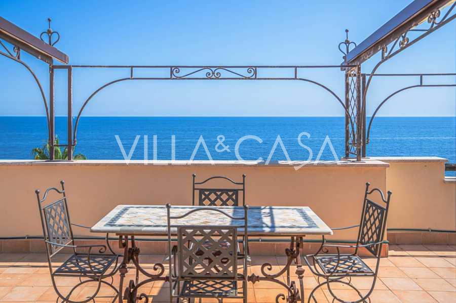 Okna nabízejí panoramatický 180stupňový výhled na moře, modrý horizont zaplňuje každý vnitřní prostor a rozprostírá se až na široké panoramatické terasy. Vnitřní prostory s vysokými stropy přes tři metry, terakotovými podlahami z té doby, mramorovým schodištěm a krbem vytvářejí atmosféru vytříbené, nadčasové elegance.
