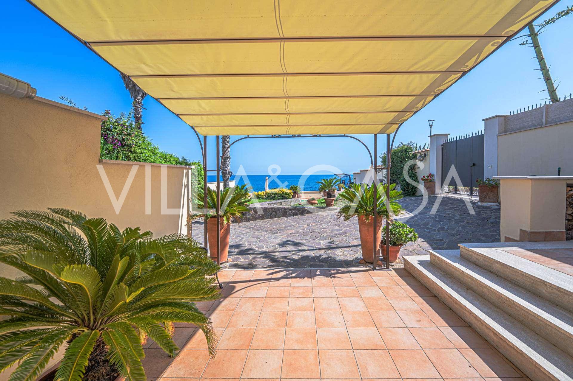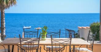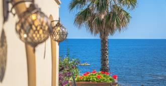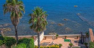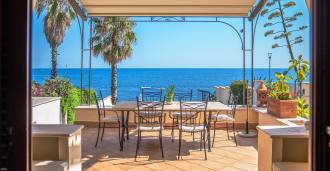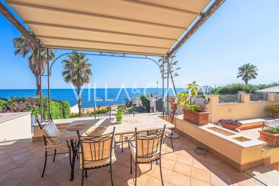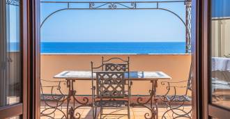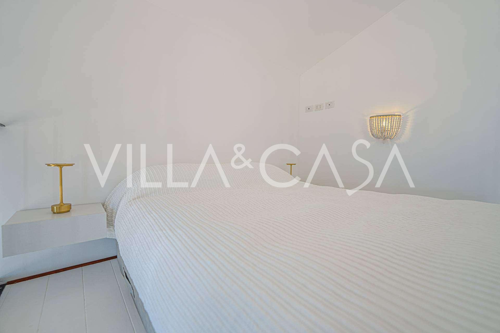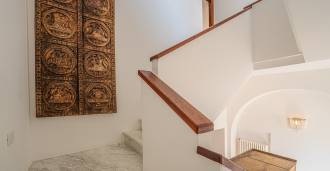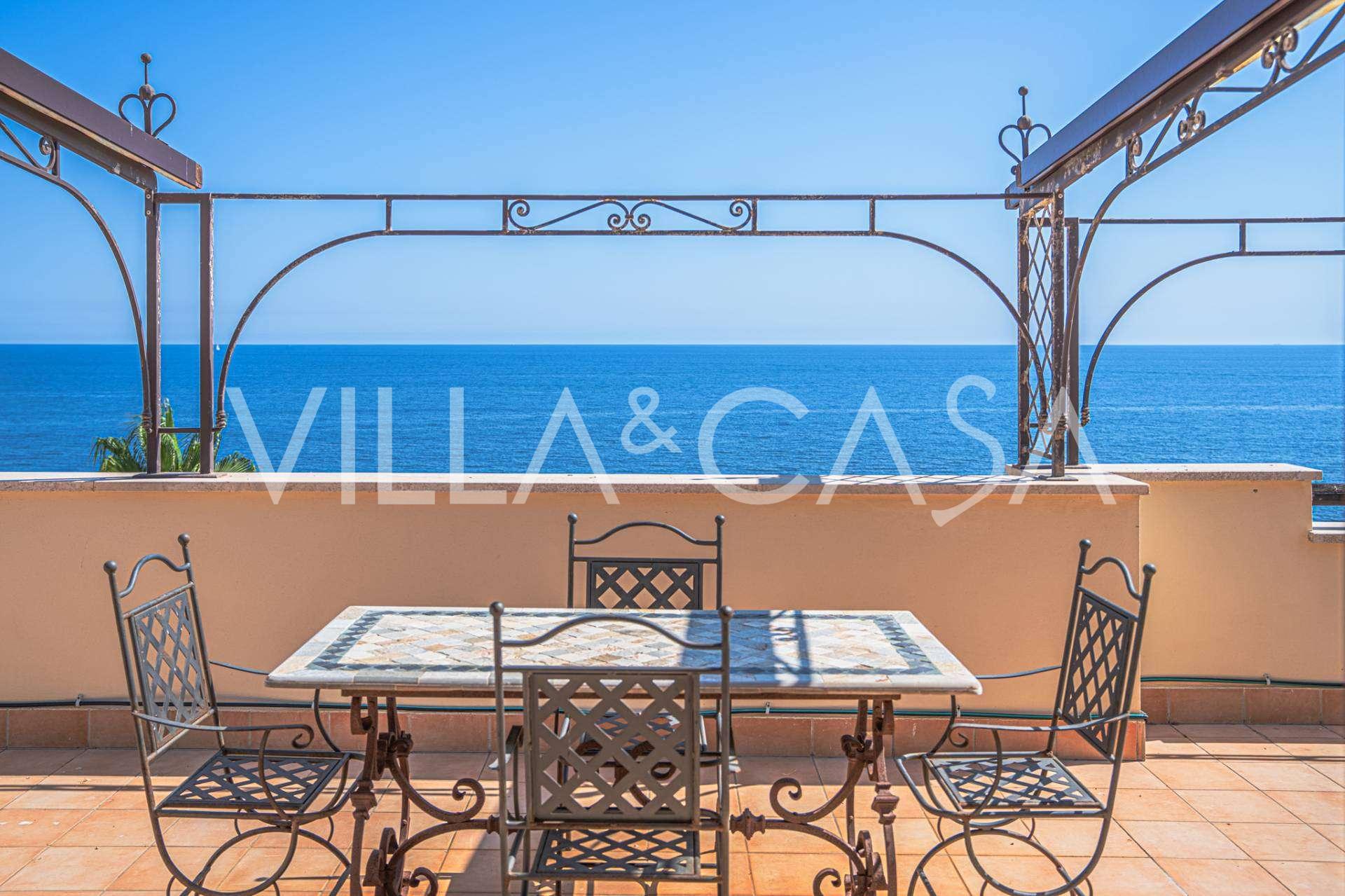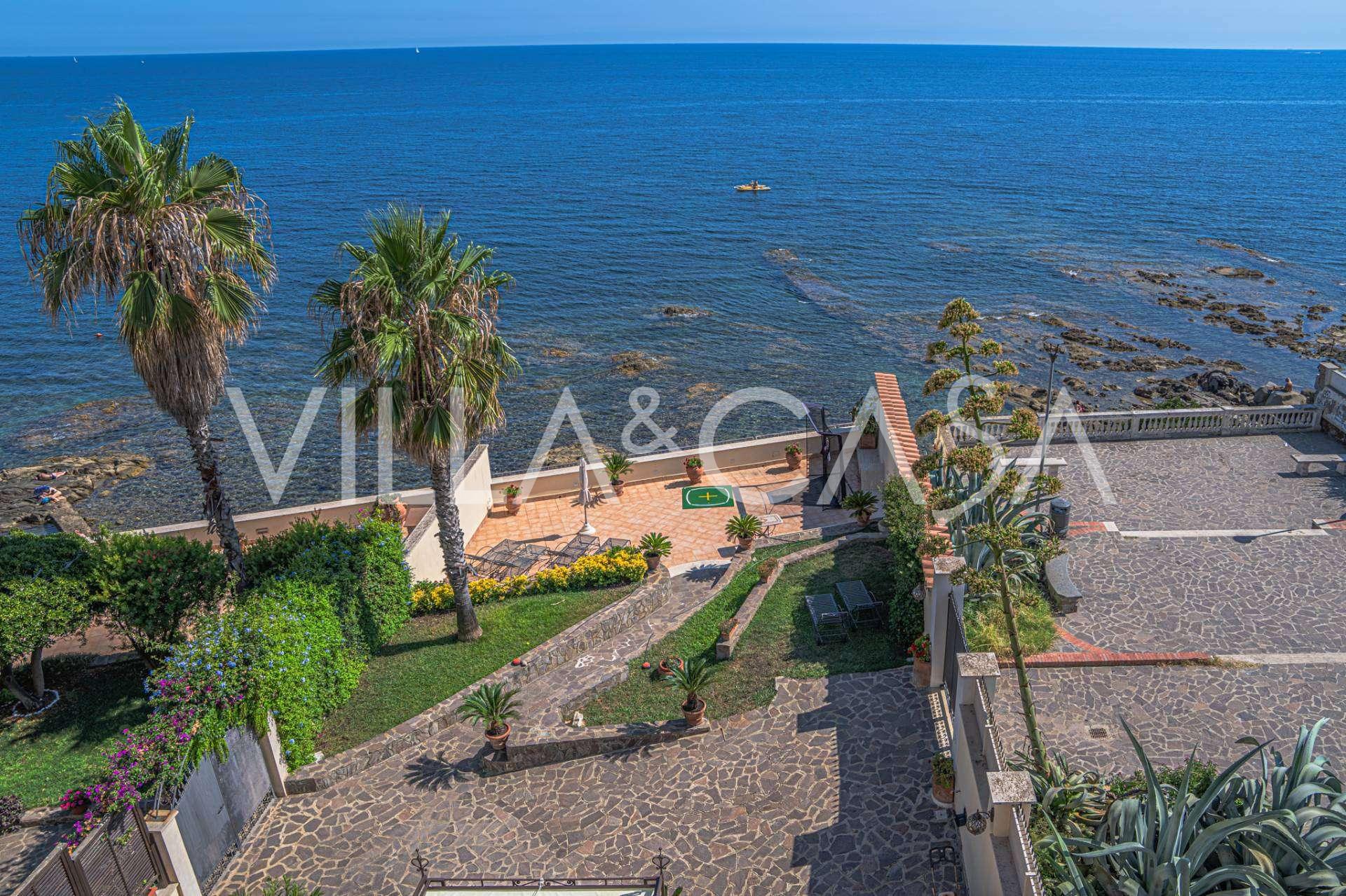 Okna nabízejí panoramatický 180stupňový výhled na moře, modrý horizont zaplňuje každý vnitřní prostor a rozprostírá se až na široké panoramatické terasy. Vnitřní prostory s vysokými stropy přes tři metry, terakotovými podlahami z té doby, mramorovým schodištěm a krbem vytvářejí atmosféru vytříbené, nadčasové elegance.