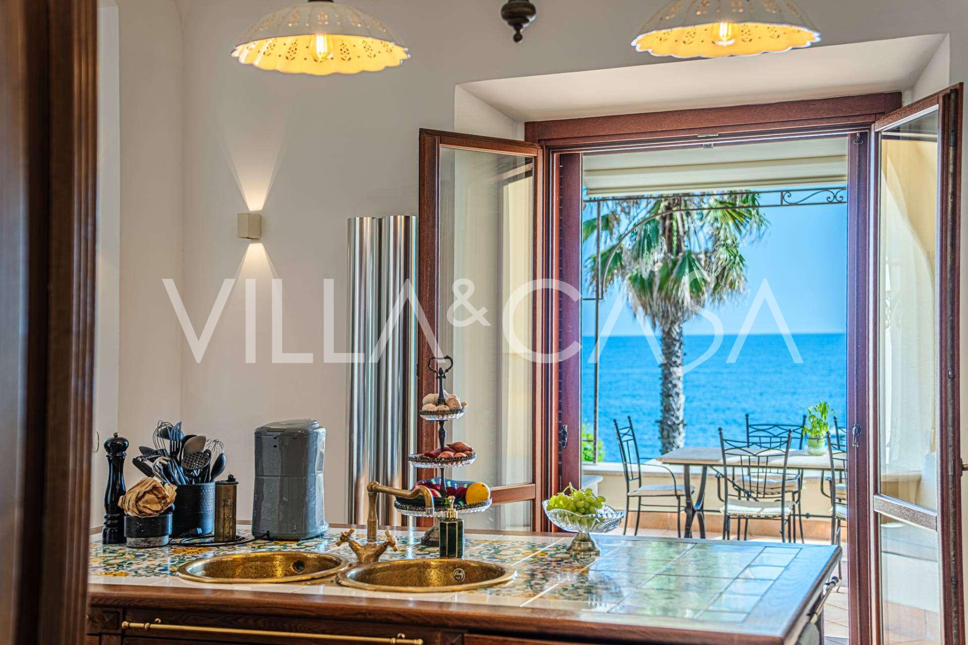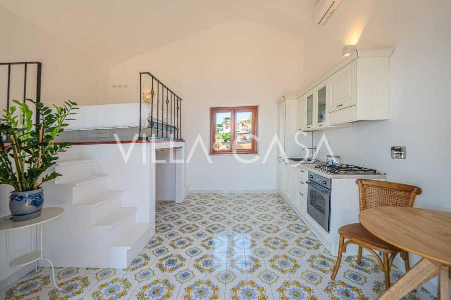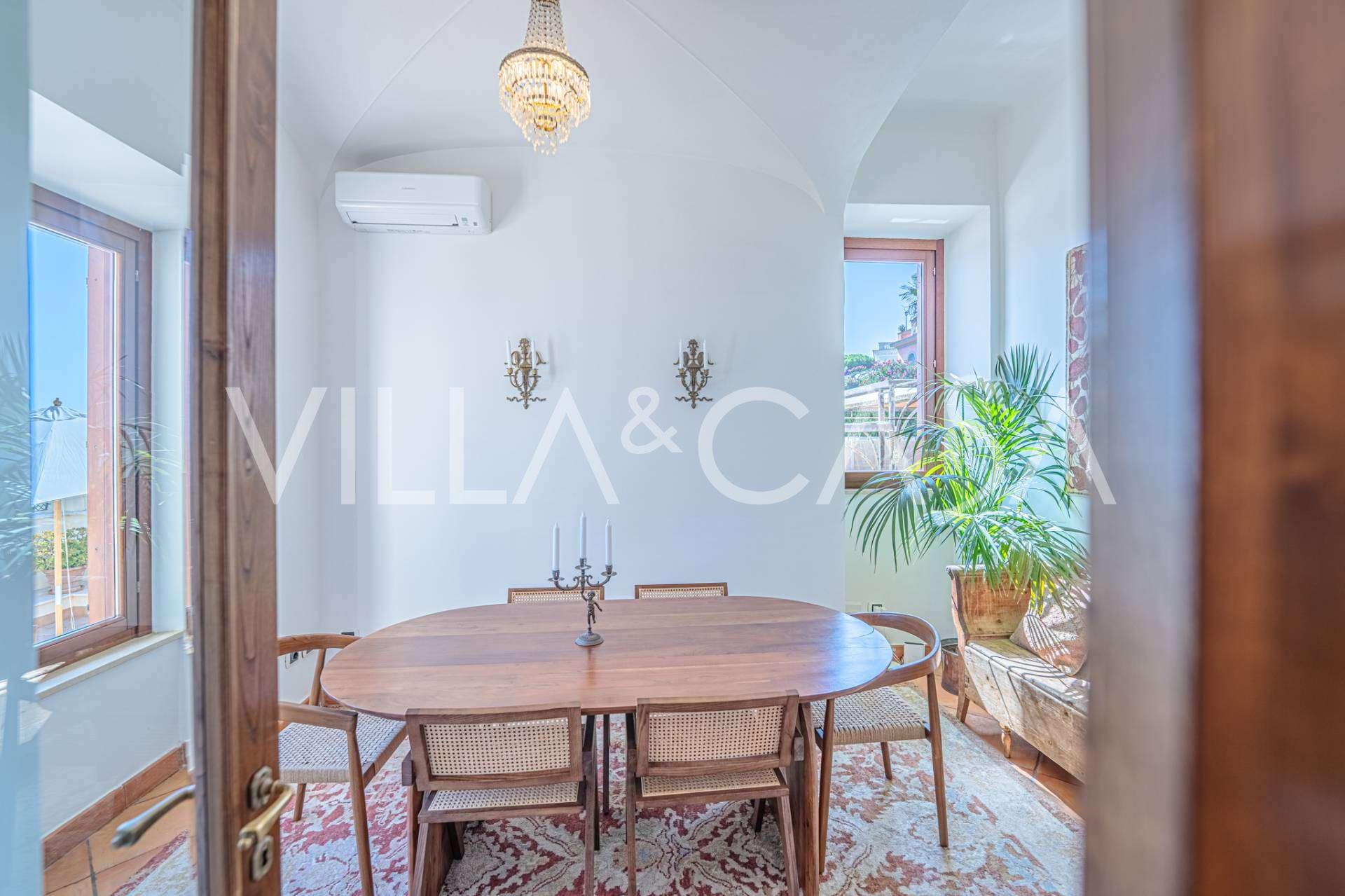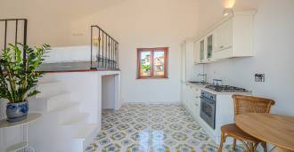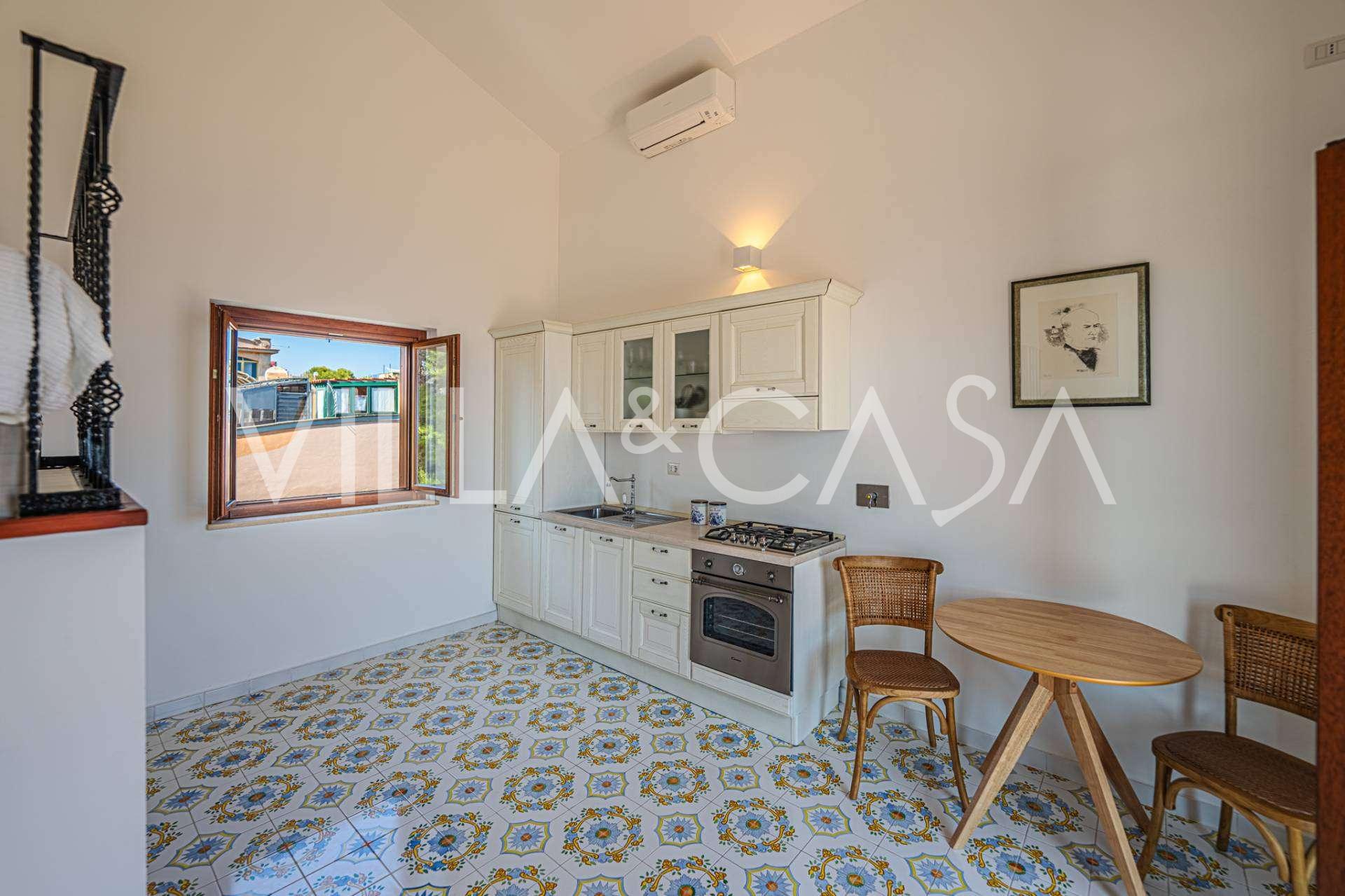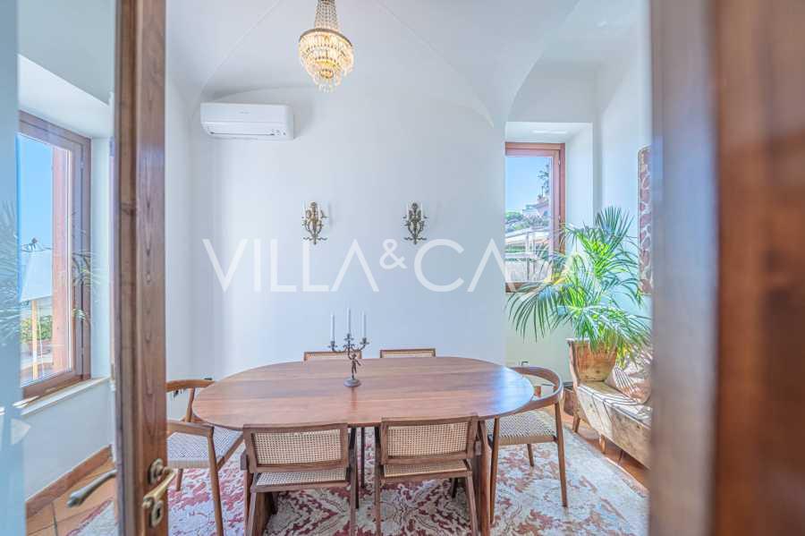 Hlavní obývací pokoj, zdobený velkými okny, vede na terasu, která je ideální pro setkávání a užívání si vzácných západů slunce. Kuchyně, vyrobená ručně na zakázku, kombinuje estetiku a funkčnost, s ostrovem zdobeným malovanými dlaždicemi z Positana a originálními měděnými dřezy.