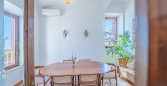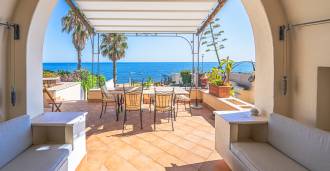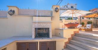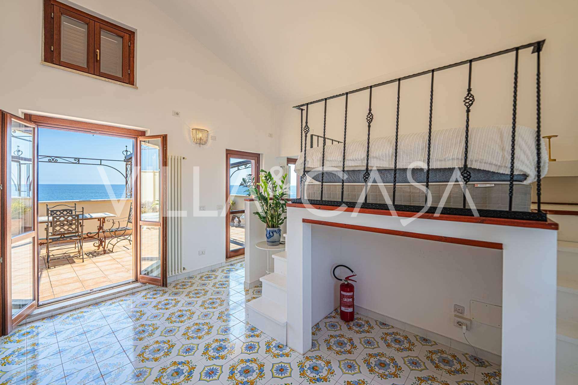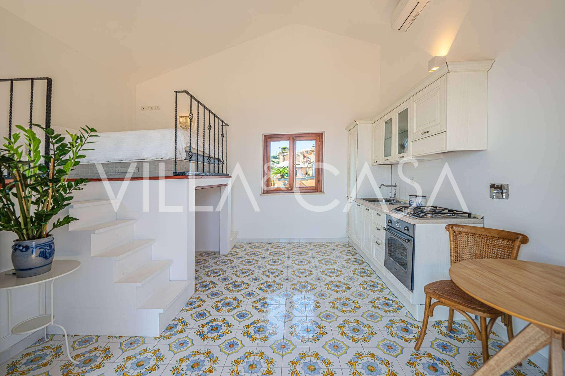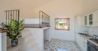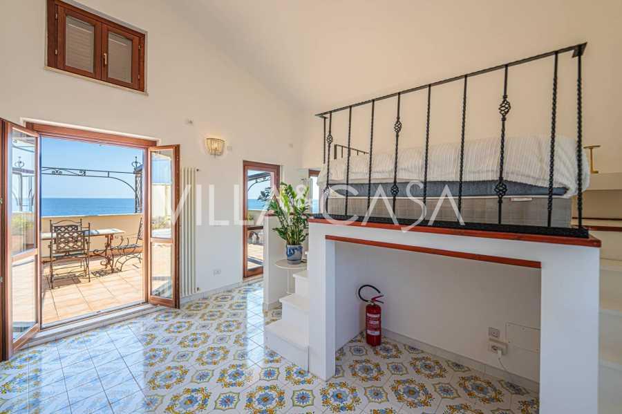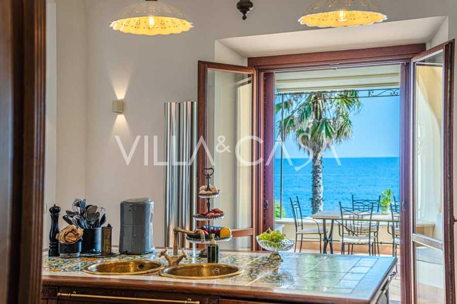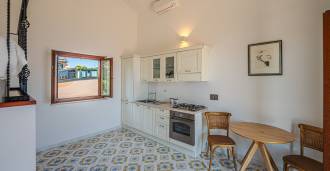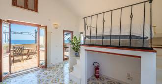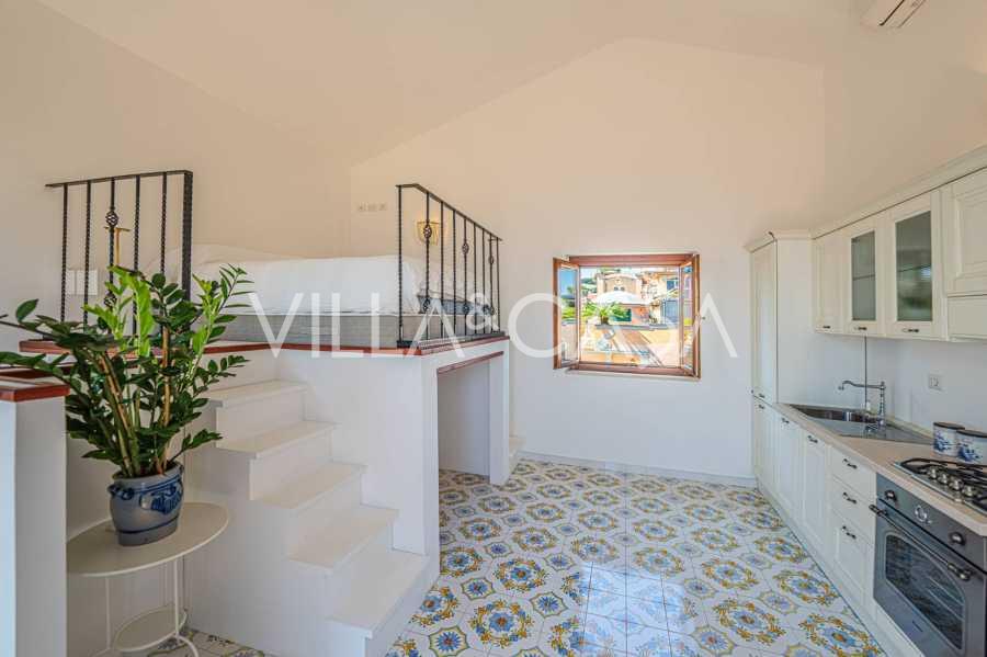 Hlavní obývací pokoj, zdobený velkými okny, vede na terasu, která je ideální pro setkávání a užívání si vzácných západů slunce. Kuchyně, vyrobená ručně na zakázku, kombinuje estetiku a funkčnost, s ostrovem zdobeným malovanými dlaždicemi z Positana a originálními měděnými dřezy.